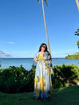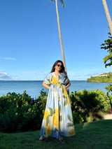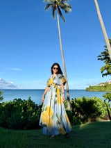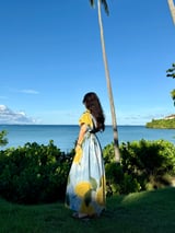 Blue Citrus Print Cotton Poplin Midi Dress with Waist Tie