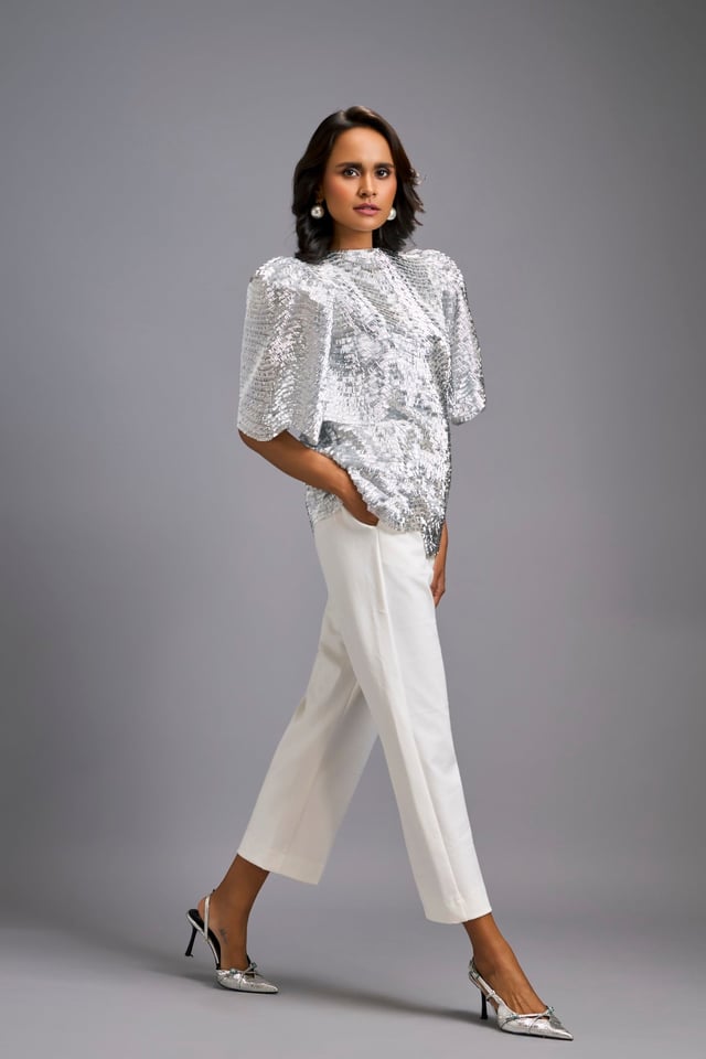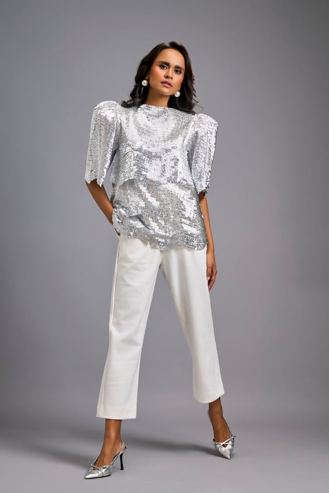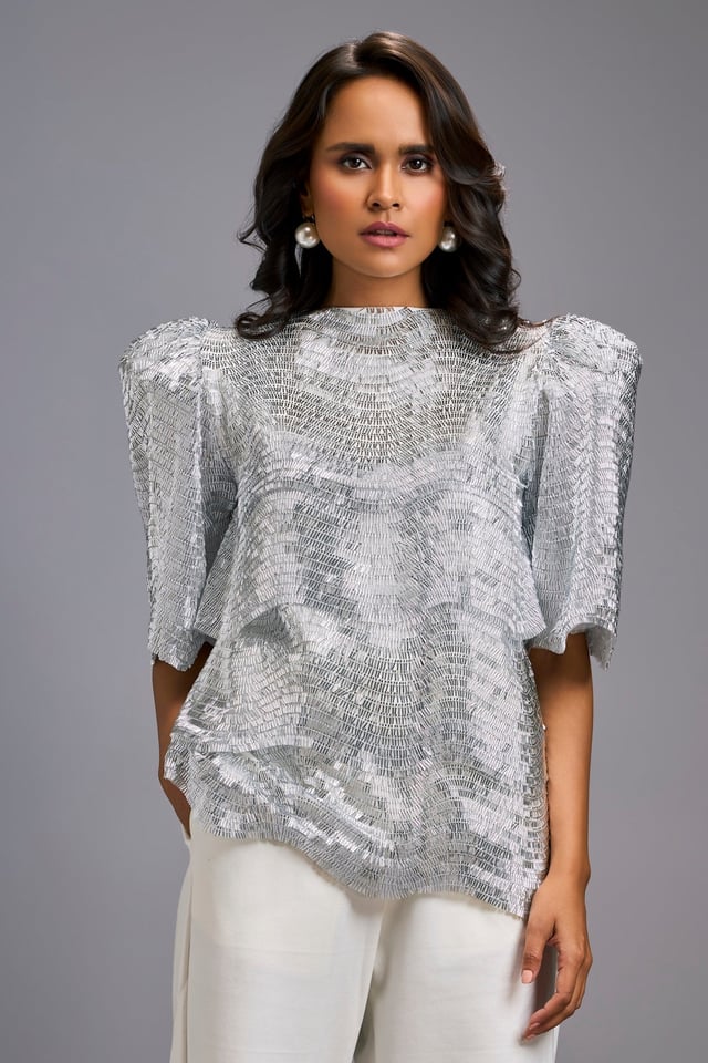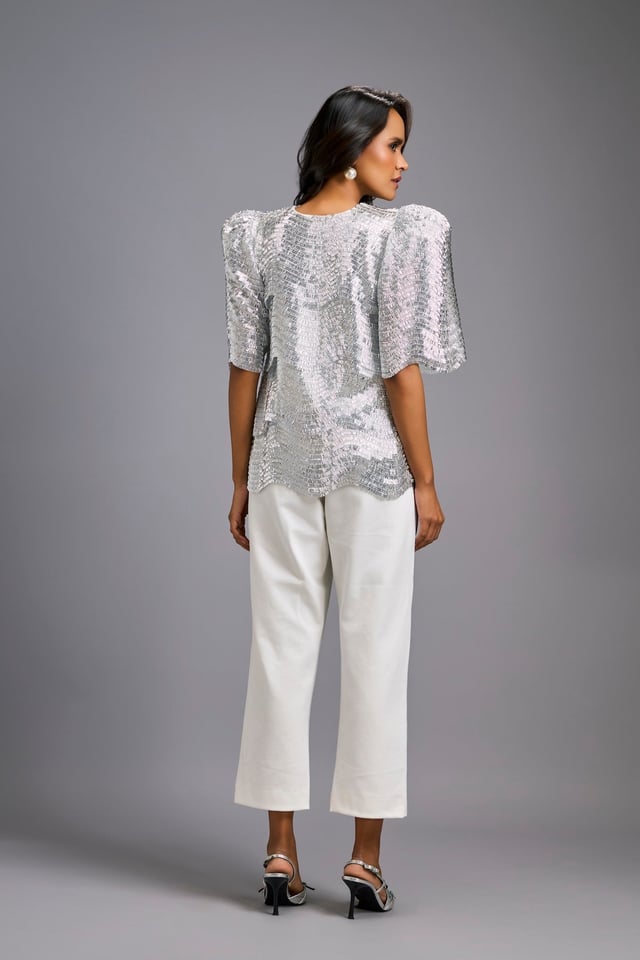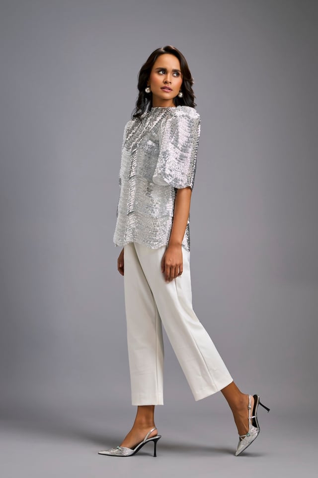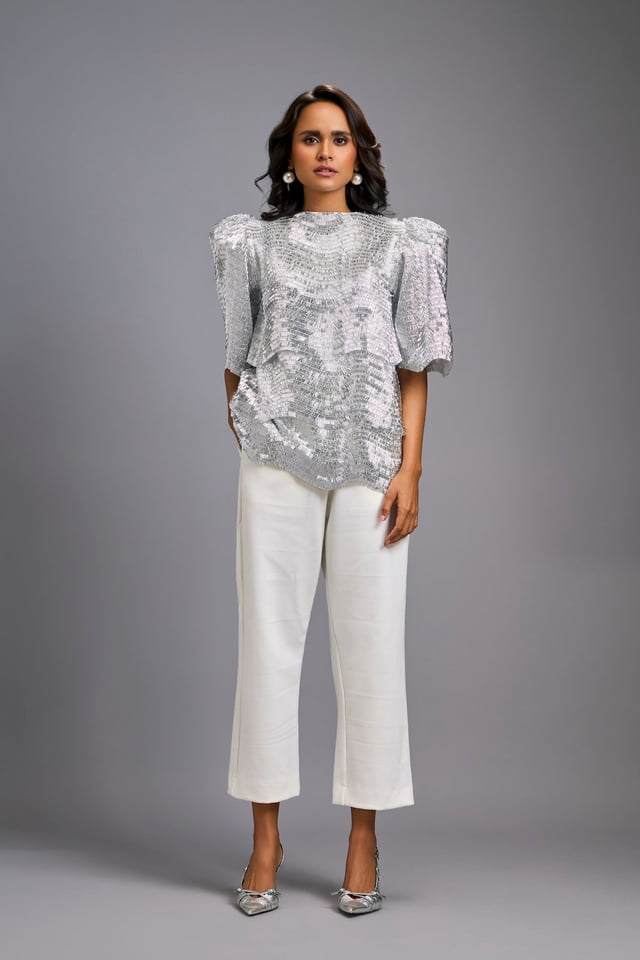 Textured Silver Shimmer Top with Sculptural Shoulders and Cropped Pants