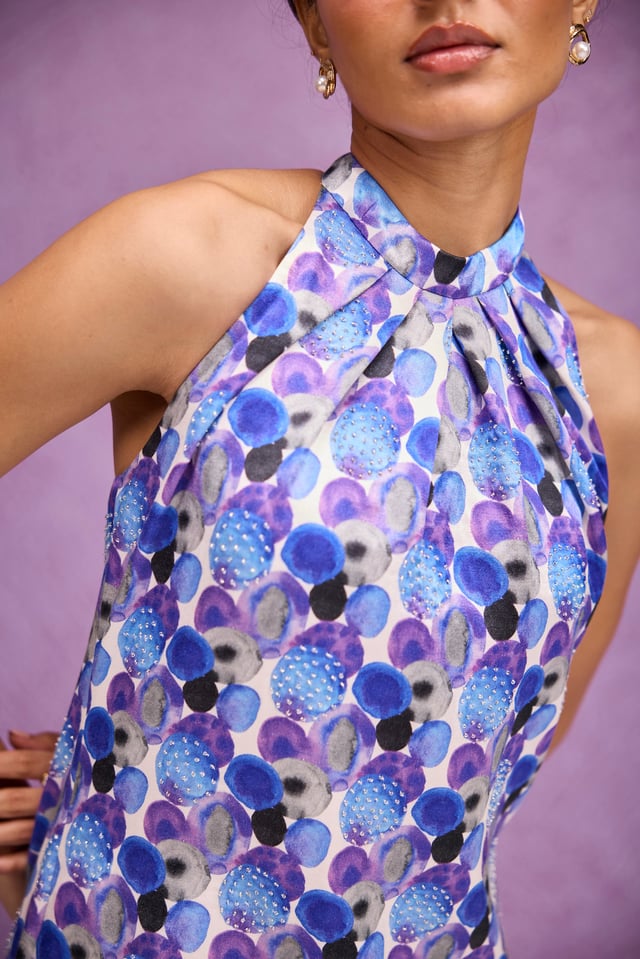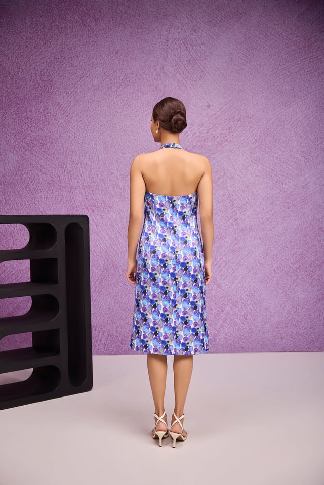 Blue Aquarelle Print Embroidered Gajji Silk Halter Neck Dress