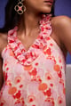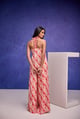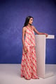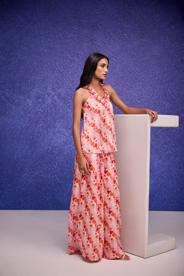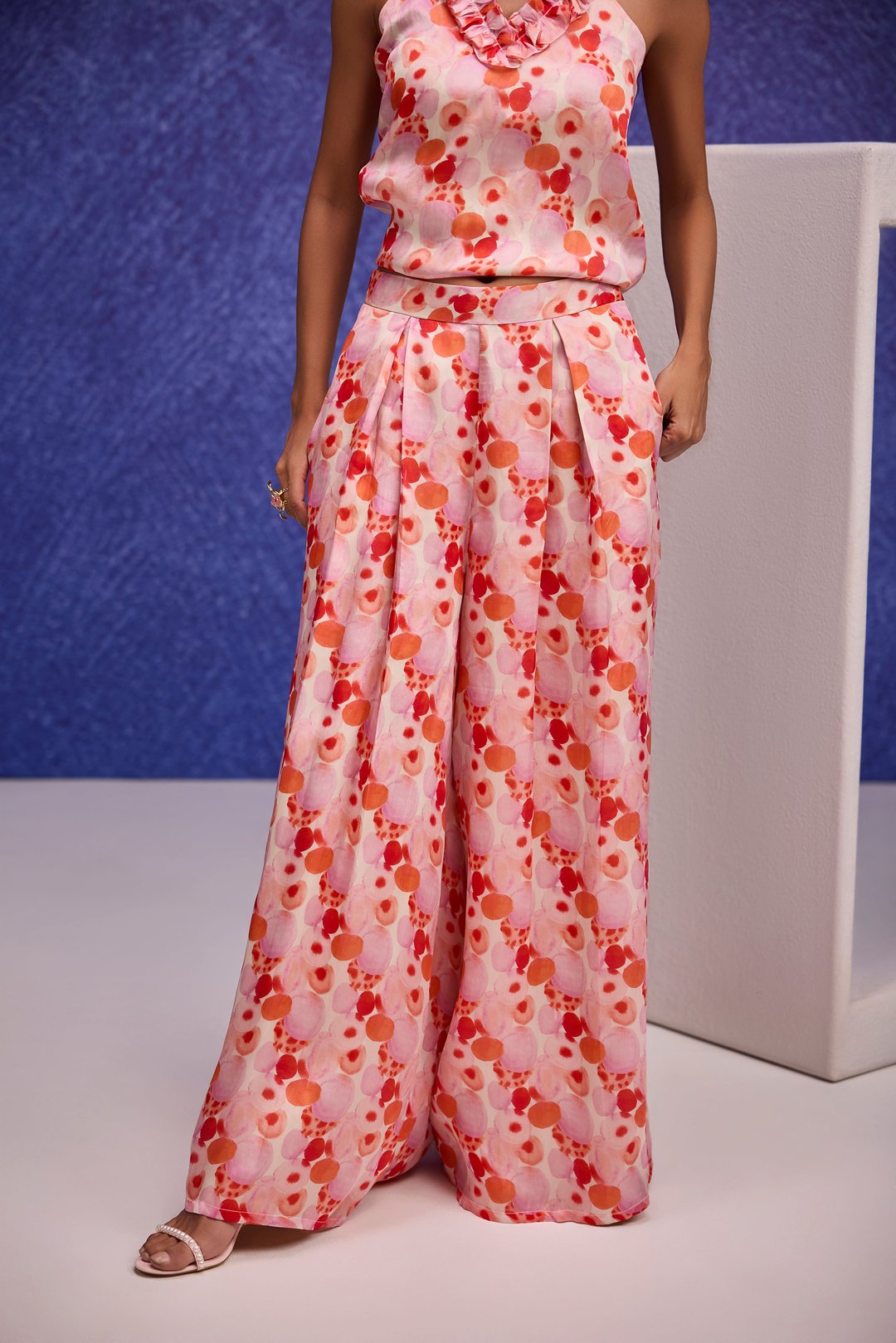 Red Aquarelle Print Silk Organza Flared Pants with Inward Pleat