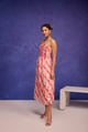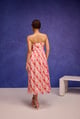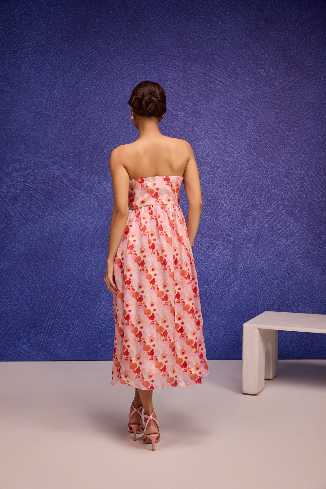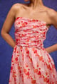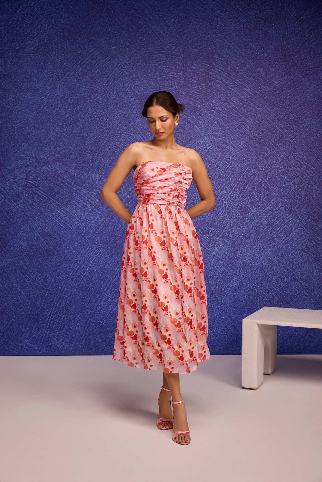 Red Aquarelle Print Silk Organza Side Gathered Tube Dress with Ruffle Detail
