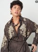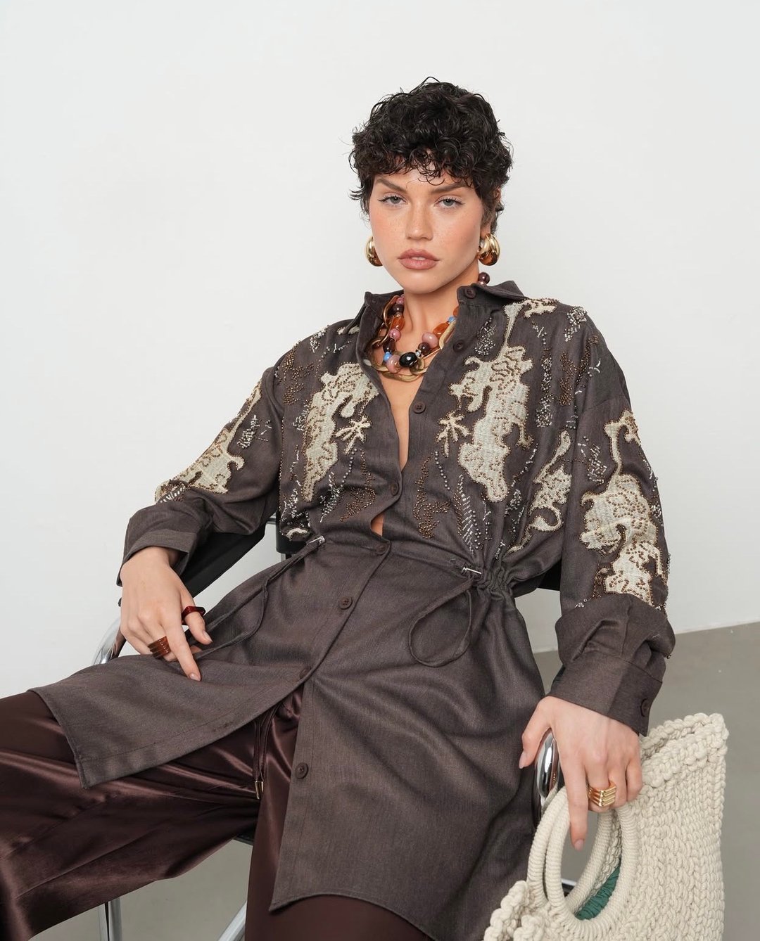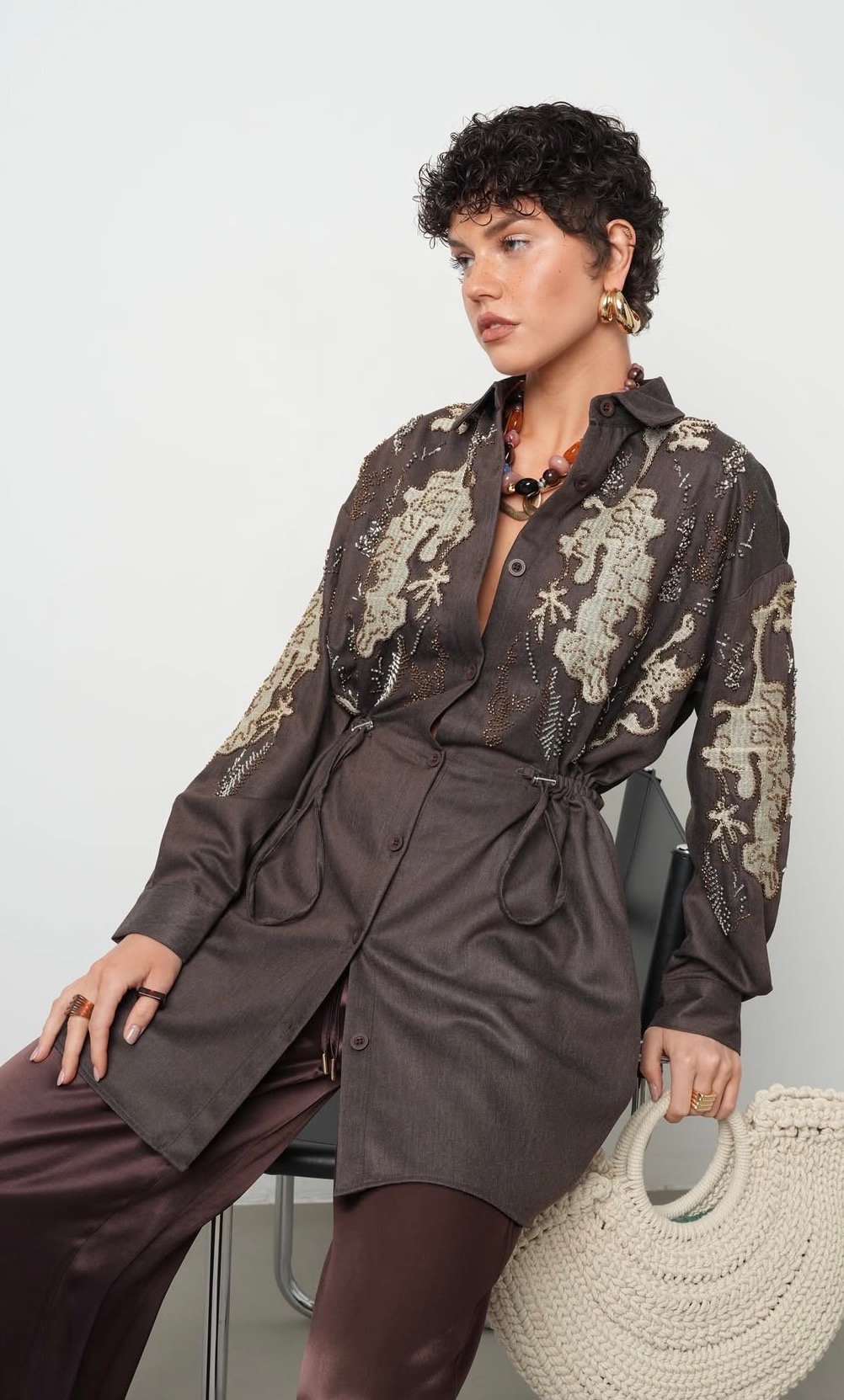 Embellished Brown Shirt Dress with a Drawstring Waist