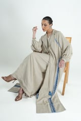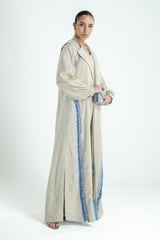 Neutral Cotton-Linen Relaxed Fit Maxi Dress with Blue Trim