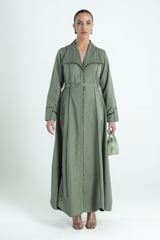 Olive Belted Trench-Style Maxi Dress with Bead-Sequin Trim