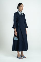 Navy Cotton Satin Embroidered Collar Maxi Dress