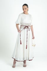 Ivory Satin Fit and Flare Maxi Dress with Embroidered Belt