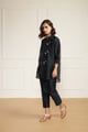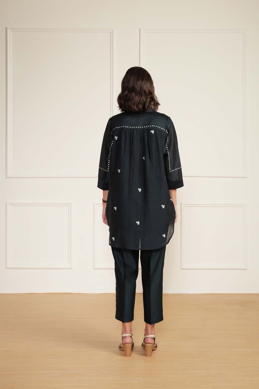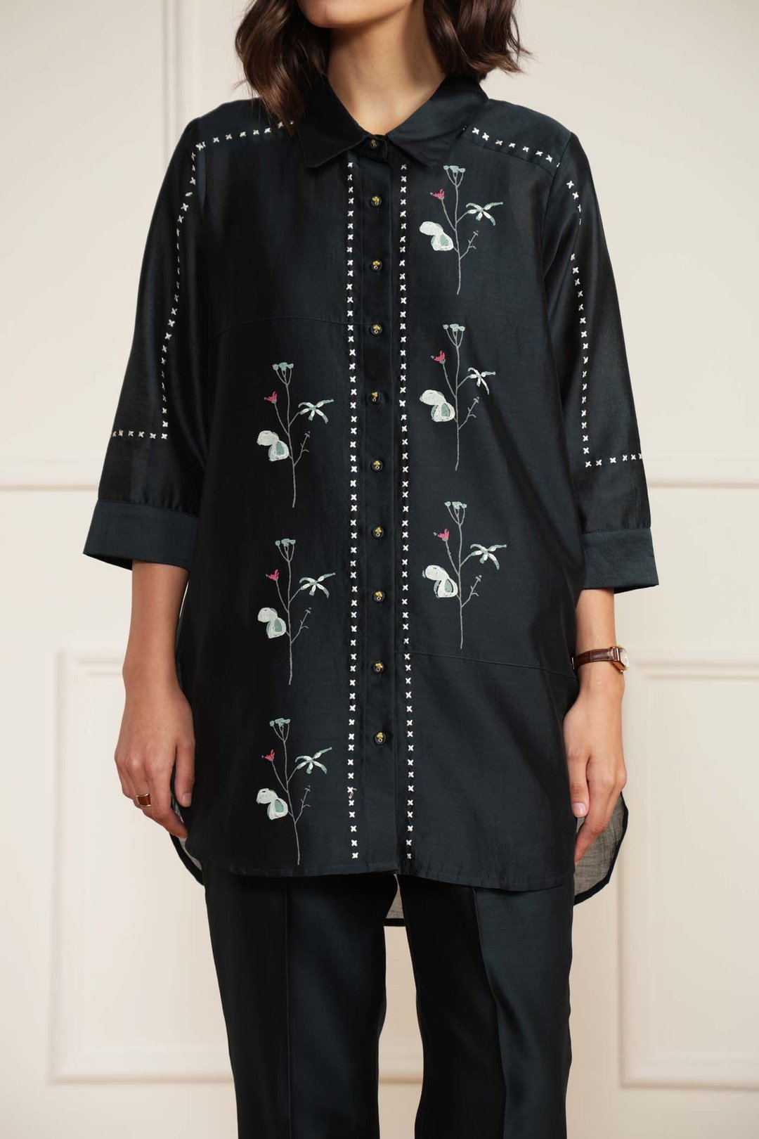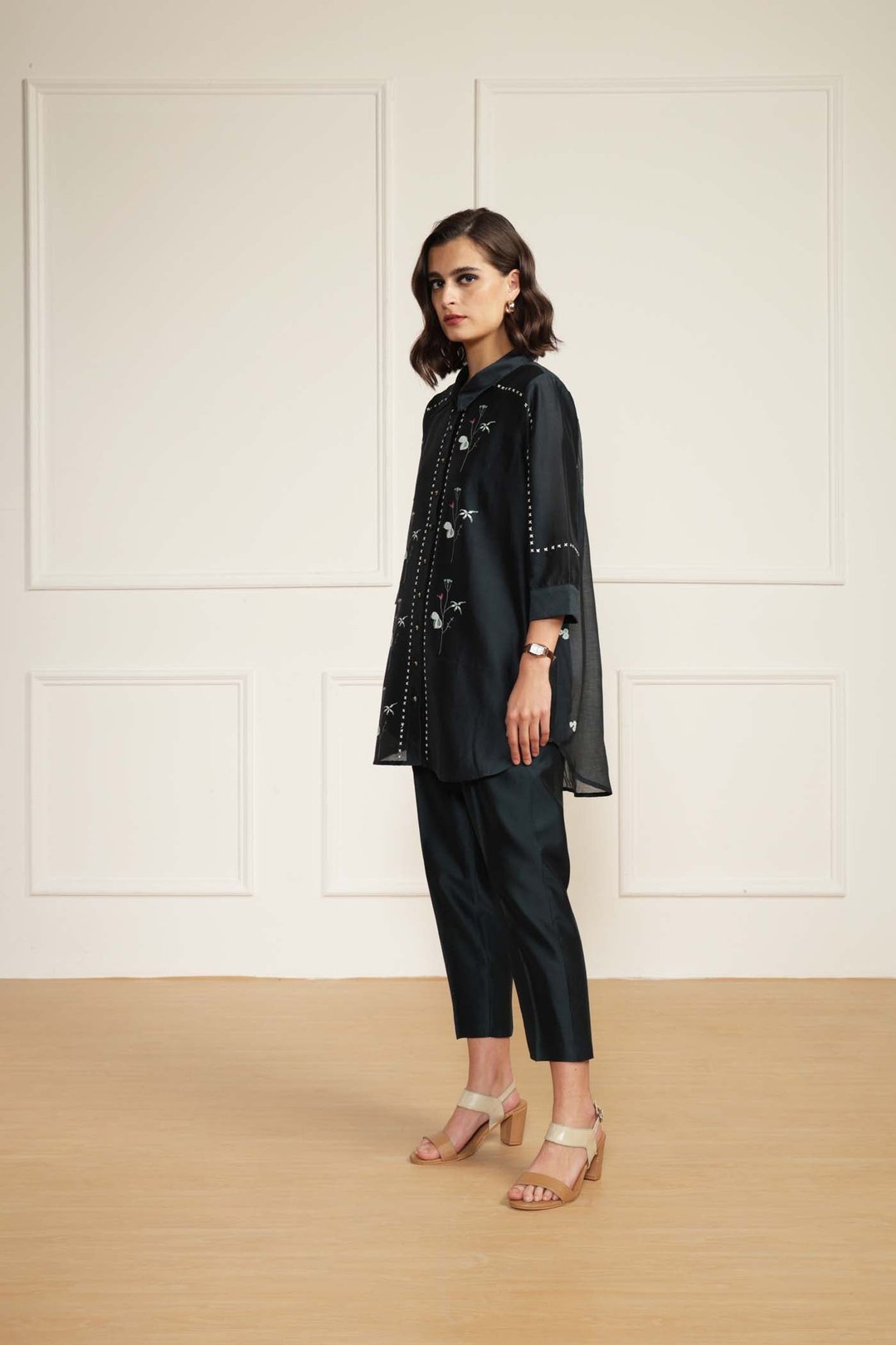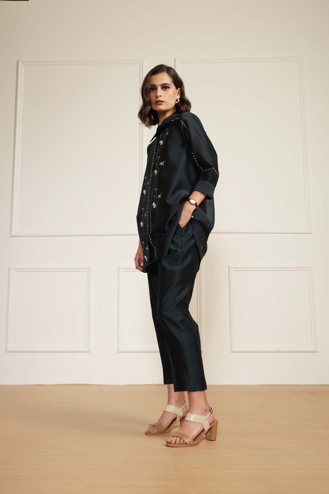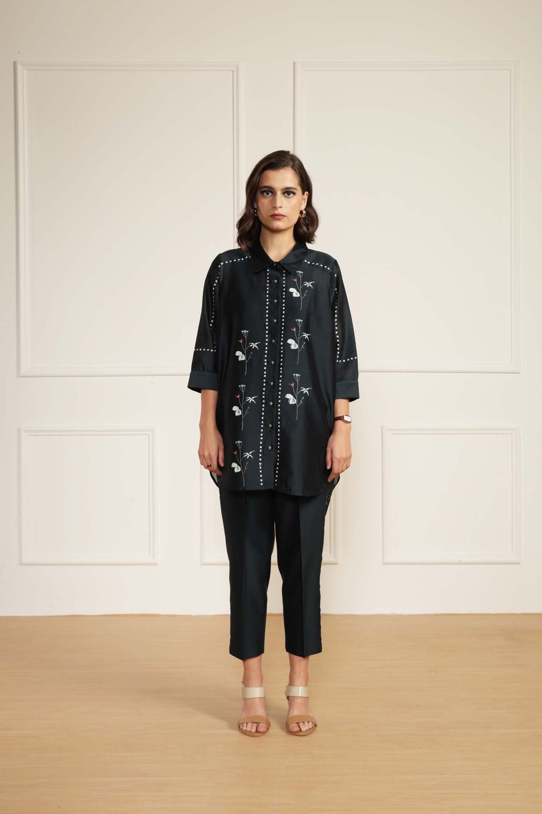 Indigo Silk Chanderi Shirt with Embroidery and Silk Chanderi Straight Pants