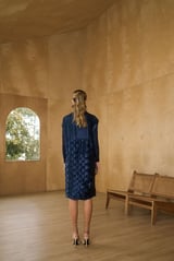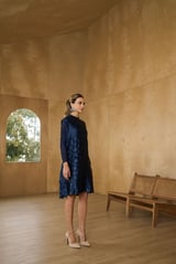 Blue Pleated Textured Midi Dress with Sheer Full Sleeves